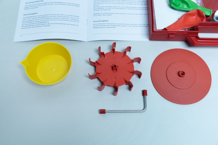 Die beiliegende Anleitung beschreibt 27 aufeinander abgestimmte Experimente, die zentrale Themen wie Druck, Auftrieb, Strömung, Verdrängung, Verdichtung, Rückstoß und Kraftübertragung behandeln. Die Versuche sind so konzipiert, dass grundlegende physikalische Prinzipien verständlich und anschaulich erfahrbar werden.