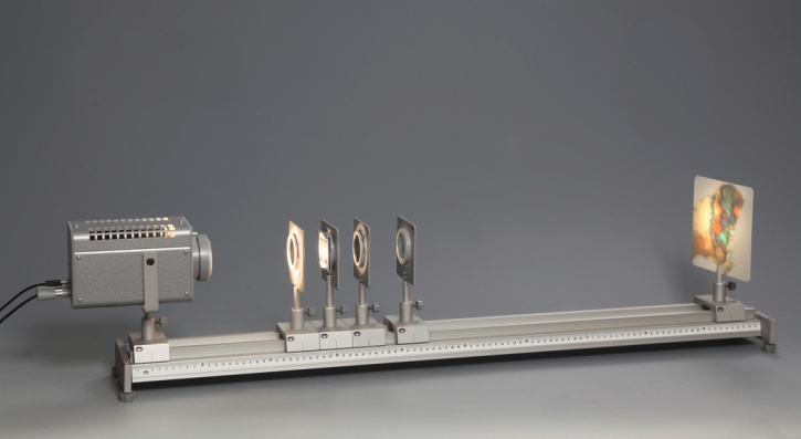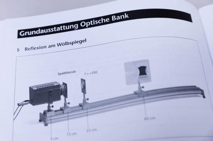 Einzelteile und Materialien: Blenden, Filter, Diapositive, Optikleuchte, Küvette, Linsen, Blenden- und Diahalter, Mattglasscheibe, Schattenkugel, Schirm- und Spiegelhalter, Prismenhalter, Reiter, Planspiegel, Wölbspiegel, Planparallele Platte, Halbzylinder, Prisma